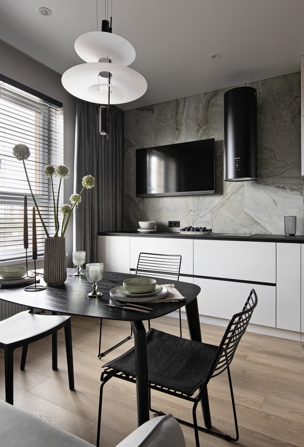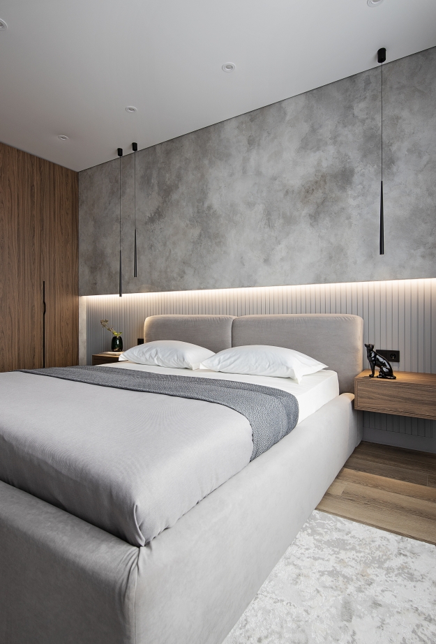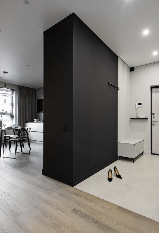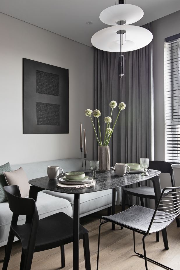 Главной задачей данного дизайна - было создать квартиру под долгосрочную аренду с эффектным, современным и уютным дизайном. Карина Еремина в лице дизайнера этого проекта, создала сдержанный, не «кричащий» интерьер, который идеально подойдет арендаторам, которые рассчитывают на домашний комфорт. В основе цвета – нейтральная серая, прохладная гамма с несколькими контрастными элементами и деревом. Например, в гостиной располагается темно-изумрудный диван и ковер с острым орнаментом. Спальня выполнена в нейтральном настроении, дабы подчеркнуть, что она способна подойти как женщине, так и мужчине. Между кухней и прихожей демонтировали межкомнатную перегородку. Ее место заняла конструкция, в которую со стороны кухни встроили пеналы с бытовой техникой. Пространство кухни выполнено без перегруженности навесными шкафами, зона фартука выделена акцентным керамогранитом. Помимо общего света, в интерьере всей квартиры продуманы дополнительные источники света, которые отвечают за подходящее по случаю настроение освещение.