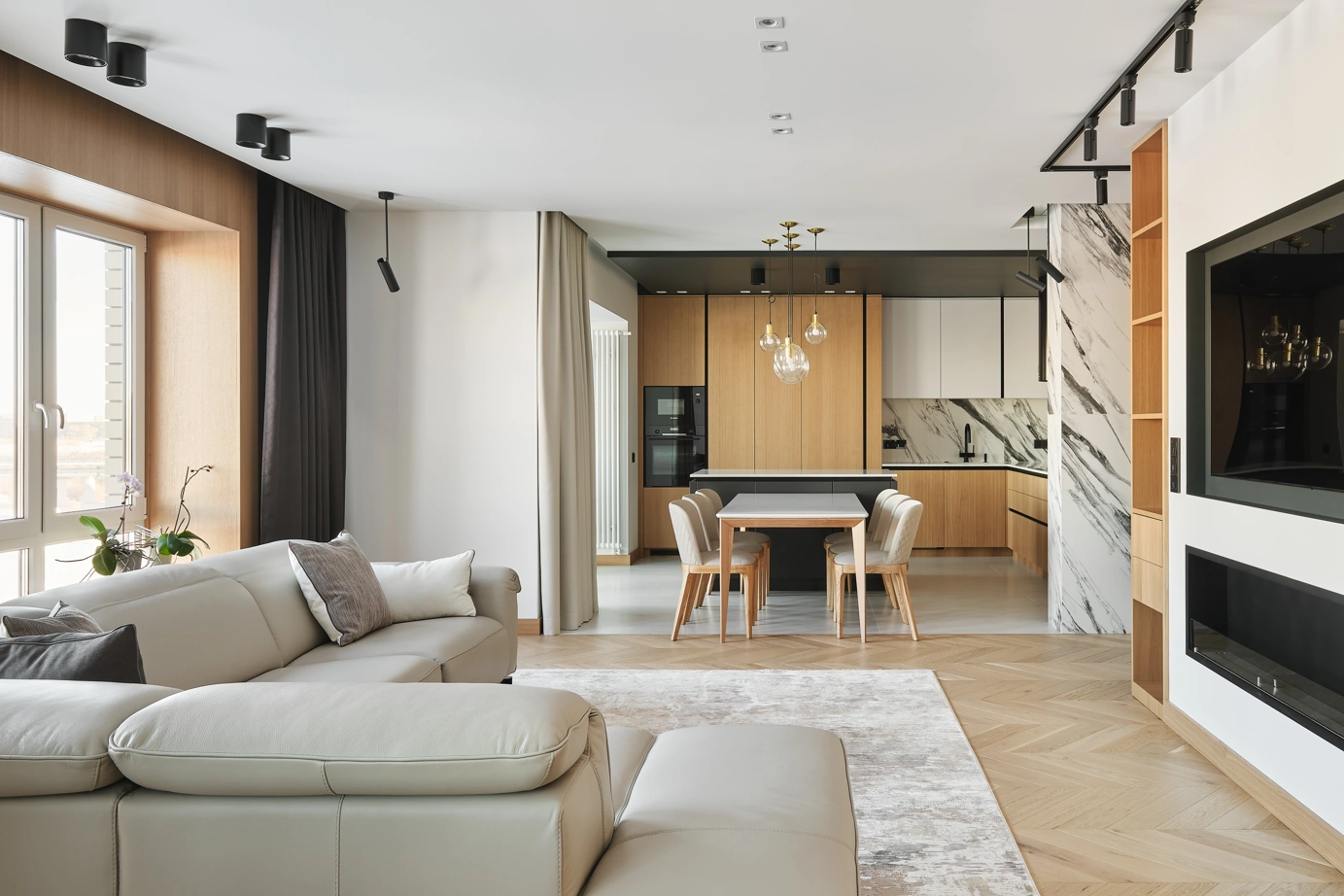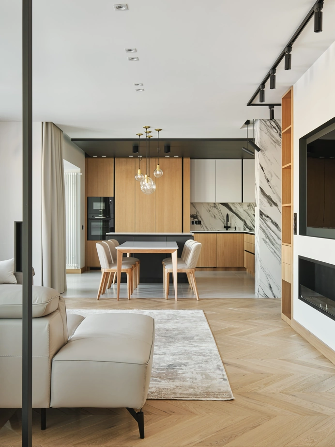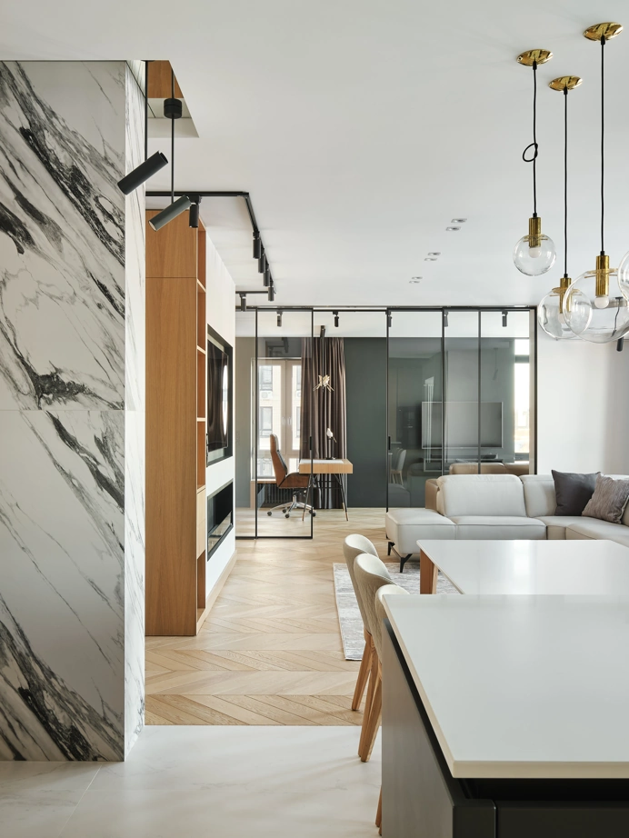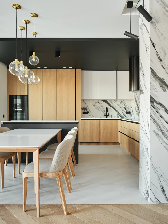 С использованием одной лишь коллекции керамогранита Charme Deluxe, дизайнер Вера Махецкая сформировала уютное пространство, в соответствии с пожеланиями обоих заказчиков. В этой квартире мужское и женское, черное и белое гармонично переплелись. В кухне-гостиной контрастные решения были объединены ярким фартуком из Статуарио Фантастико в крупном формате 80х160 и нейтральным полом, оформленным Бьянко Микеланджело также в большом формате 80х160 см.
