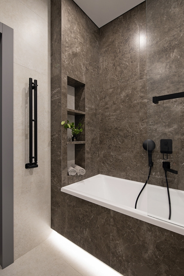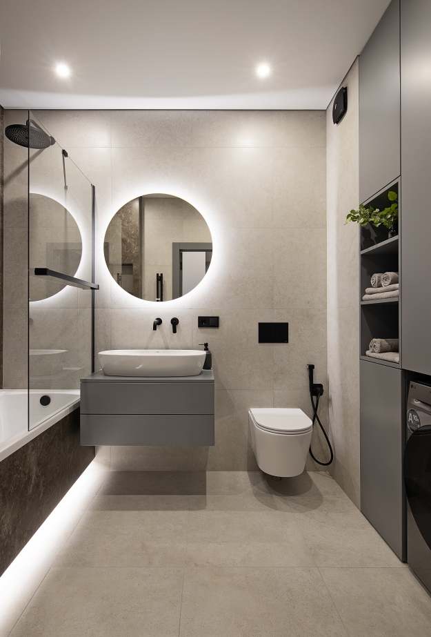 В проекте использовался керамогранит ITALON следующих коллекций: Вандефул лайф Графит, Дженезис Мун Уайт, Рум Грей Стоун.