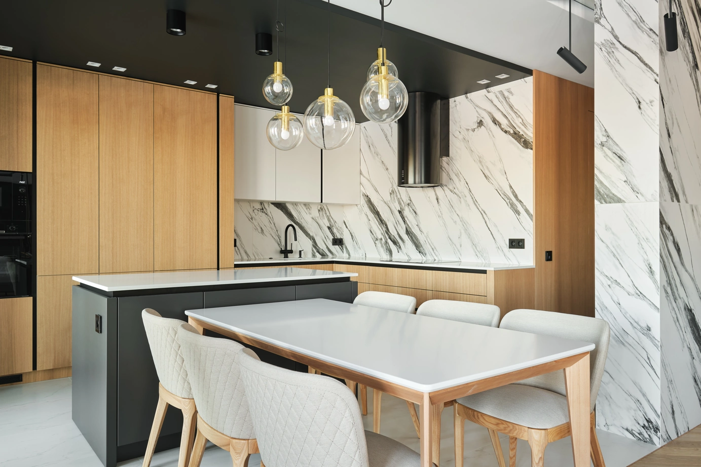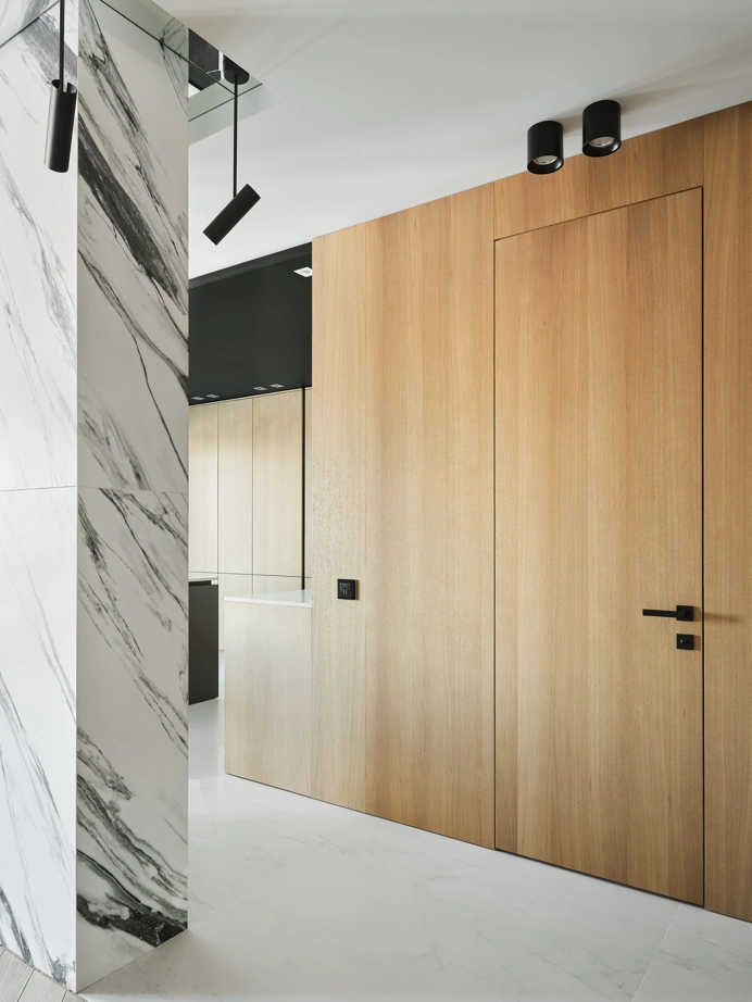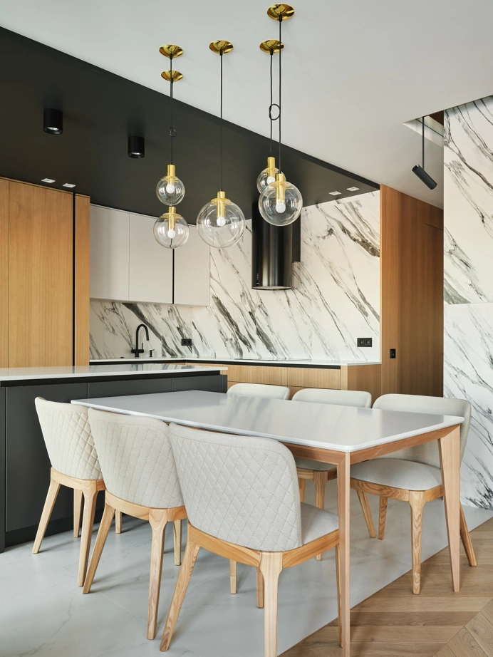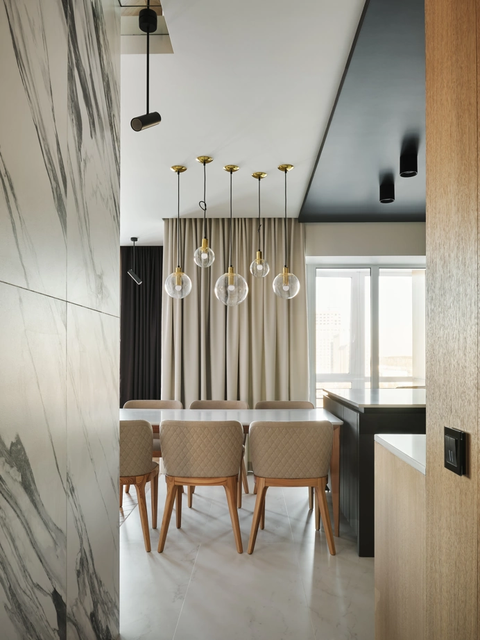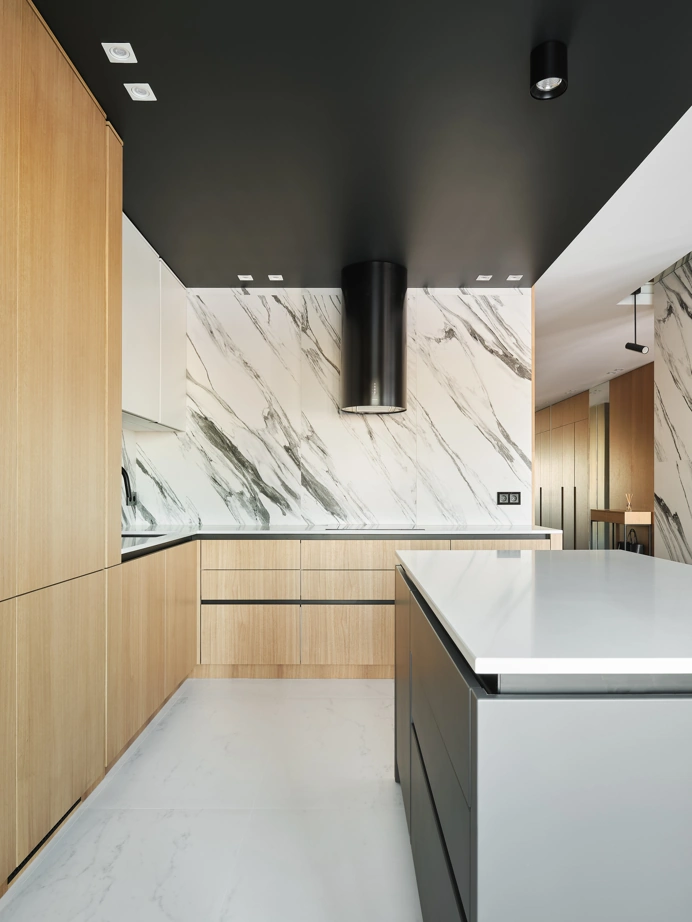 С использованием одной лишь коллекции керамогранита Charme Deluxe, дизайнер Вера Махецкая сформировала уютное пространство, в соответствии с пожеланиями обоих заказчиков. В этой квартире мужское и женское, черное и белое гармонично переплелись. В кухне-гостиной контрастные решения были объединены ярким фартуком из Статуарио Фантастико в крупном формате 80х160 и нейтральным полом, оформленным Бьянко Микеланджело также в большом формате 80х160 см.